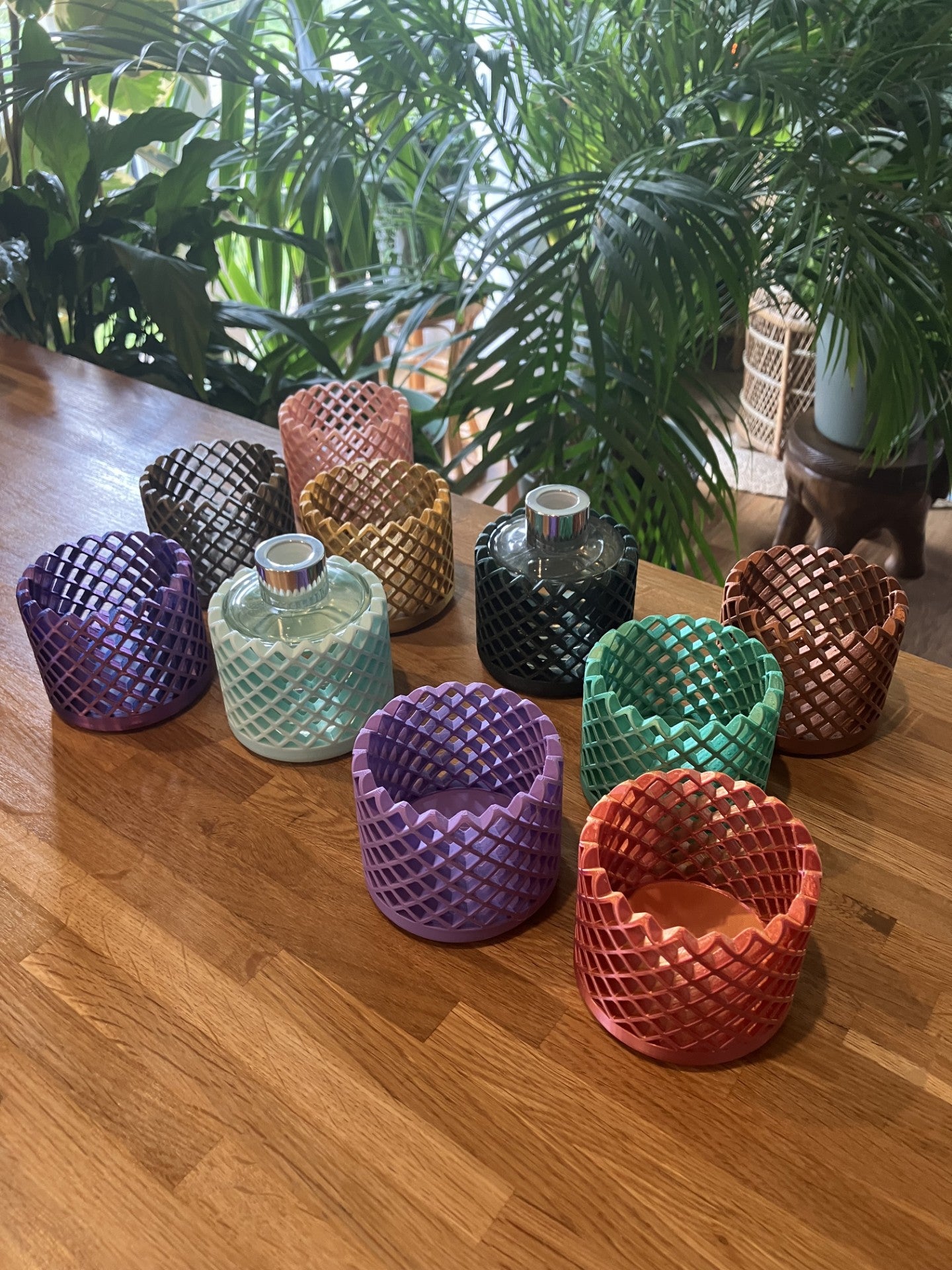 Add a touch of style to your home fragrance setup with our 3D Printed Reed Diffuser Bottle Sleeve, designed to fit standard 100 ml diffuser bottles. This decorative sleeve not only enhances the look of your diffuser but also adds a modern, artistic flair to any room.